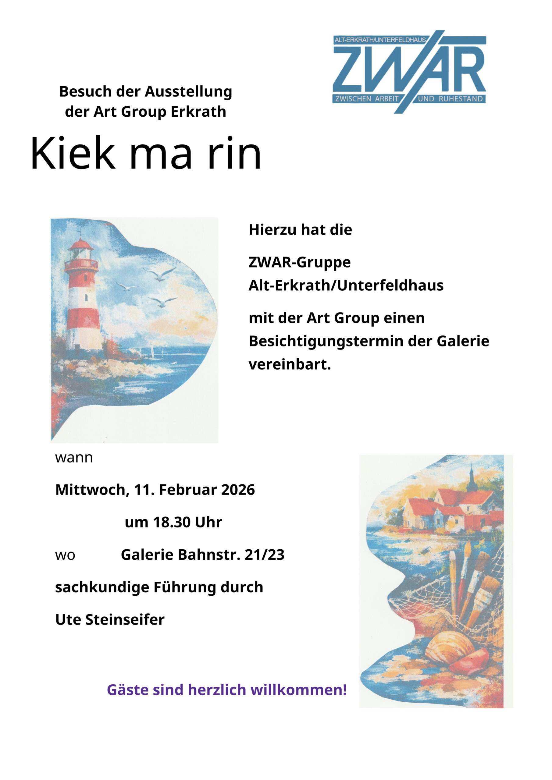 Zu unserem Basistreffen am 11. Februar besichtigt die ZWAR-Gruppe Alt-Erkrath/Unterfeldhaus die Ausstellung der Erkrather Art Group „Kiek ma rin“.